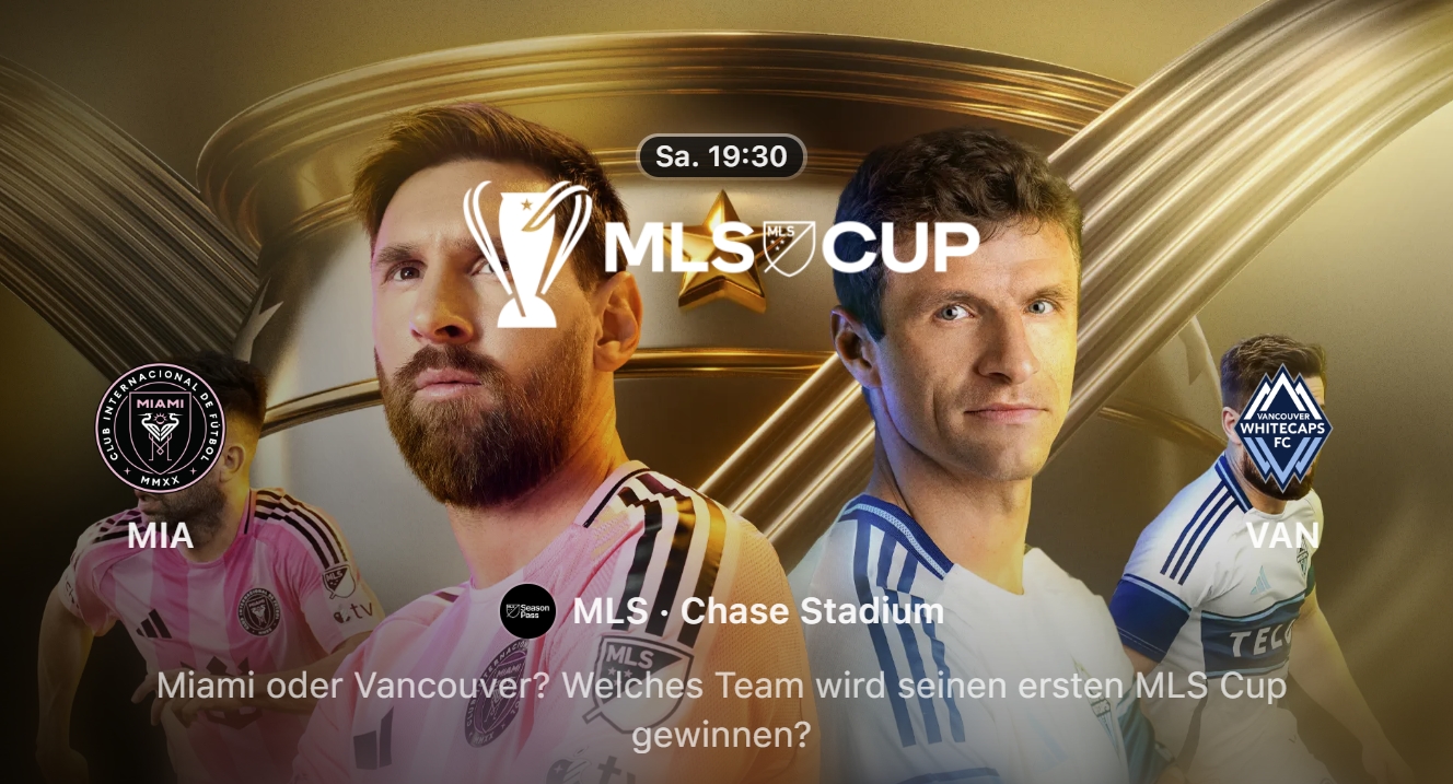 Wenn du keinen MLS Season Pass, aber Apple TV+ abonniert hast, kannst du eine Auswahl von MLS- und Leagues-Cup-Spielen, einschließlich einiger der größten Playoff-Spiele, ohne zusätzliche Kosten ansehen. Eine eingeschränkte Anzahl von Spielen ist kostenlos in der Apple TV App verfügbar, wenn du dich mit Deiner Apple-ID anmeldest.